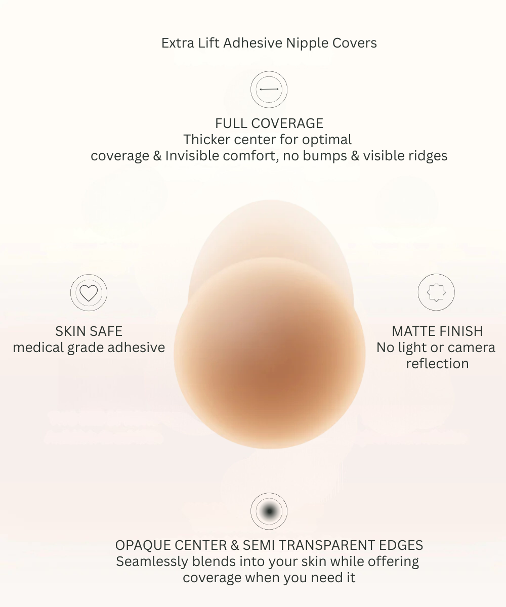 Extra Lift Adhesive Nipple Covers deliver a subtle lift and a perfectly rounded shape—no bra needed. Crafted from matte silicone, they provide a smooth, seamless look under any outfit.