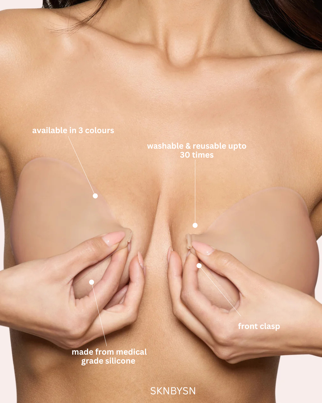Introducing the SKNBYSN Silicone Adhesive Bra reusable adhesive bra that gives the girls full coverage and support while cinching in the cleavage. Made from the signature matte silicone for smooth, seamless coverage that is reusable over 50 times with proper care. Best for small to medium busts.